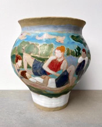 I explore the figure in my paintings, their relationship to each other and their surroundings. My hand-built ceramics connect to my paintings thgought expressive forms and luscious colours.